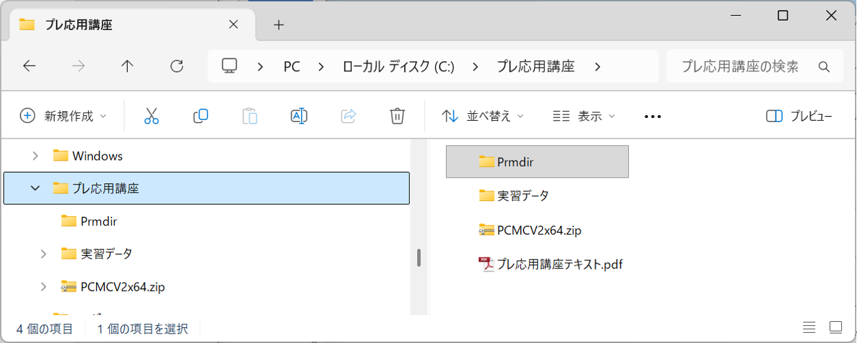今回は、「C:\プレ応用講座」フォルダー内にある「PrmDir」フォルダーを利用します