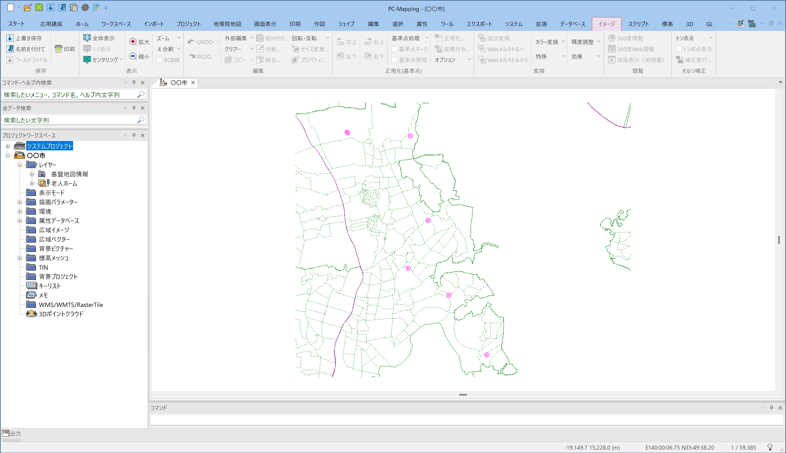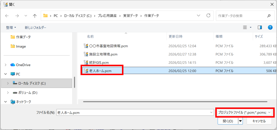 4.6.2.「老人ホーム」プロジェクトの追加 Tweet 「4.6.1.元となる基盤値情報の設定」」で作成した「作業データ」フォルダー内の「施設立地環境.pcm」に対し、「4.3.アドレスマッチングデータ」で作成したプロジェクト(老人ホーム.pcm)を追加します。 音声 by 動画制作会社VIDWEB プロジェクトファイルを追加 ①[プロジェクトエキスパート]で、プロジェクトタイトル をマウスクリックでカレントとしてから、【追加】ボタン -[ファイル読み込み]をクリックし、[ファイルを 開く]ダイアログボックスを表示します。 ②ファイルの種類を「プロジェクトファイル(pcm、 pcms)」としてから、「老人ホーム.pcm」を指定し、 【開く】ボタンをクリックします。 ③老人ホームのポイントデータが追加されます。 老人ホームレイヤーを前景とすると、ピンク色に強調表示 されたポイントが確認できます。 ④プロジェクトを 【上書保存】します。