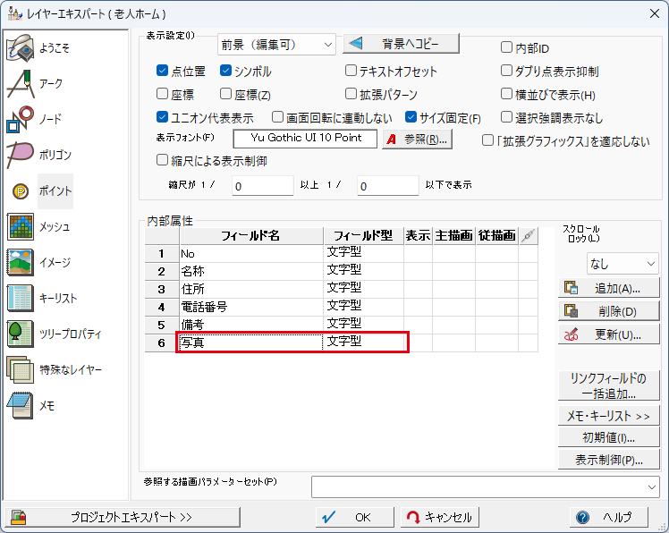 既にアドレスマッチングで生成したポイントに属性として「写真」を「施設立地環境.pcm」に登録します。