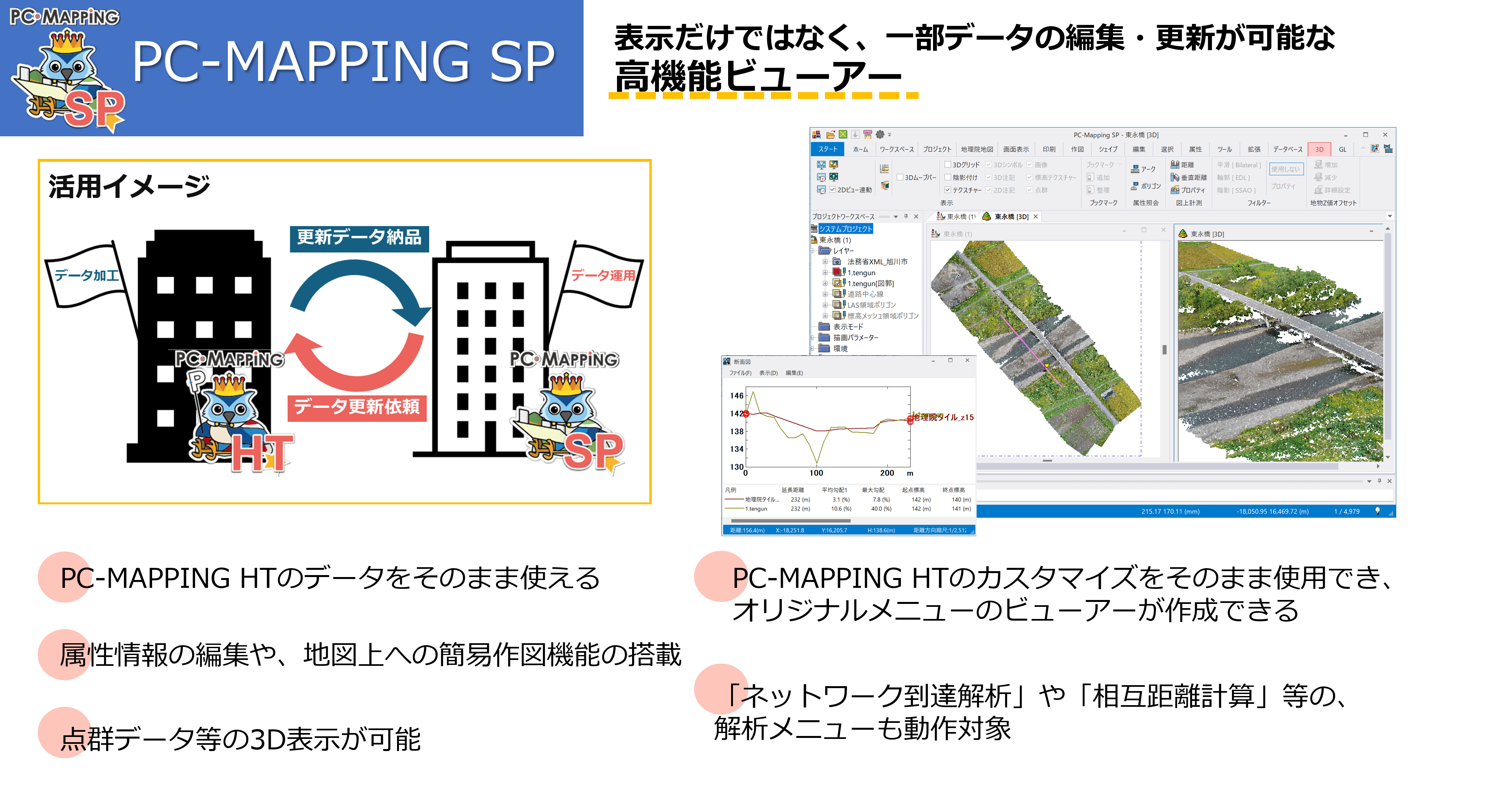 PC-MAPPING SPは、表示だけではなく、一部データの編集・更新が可能な高機能ビューアーです。