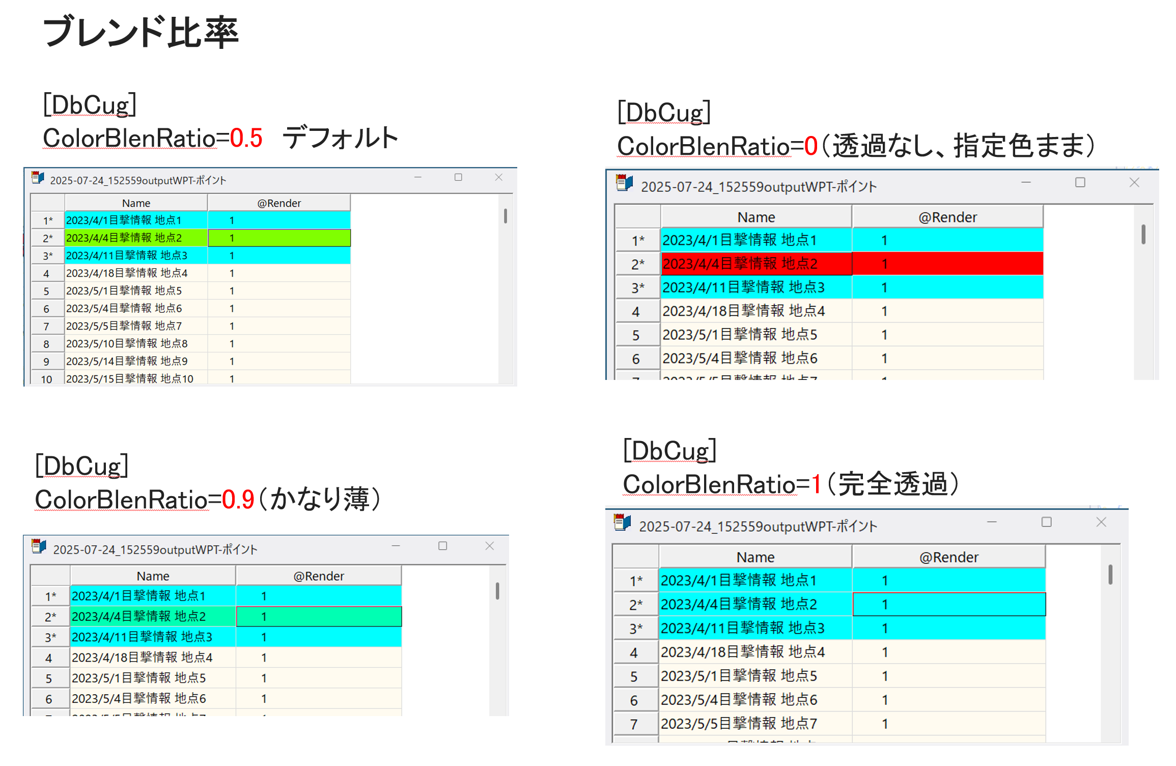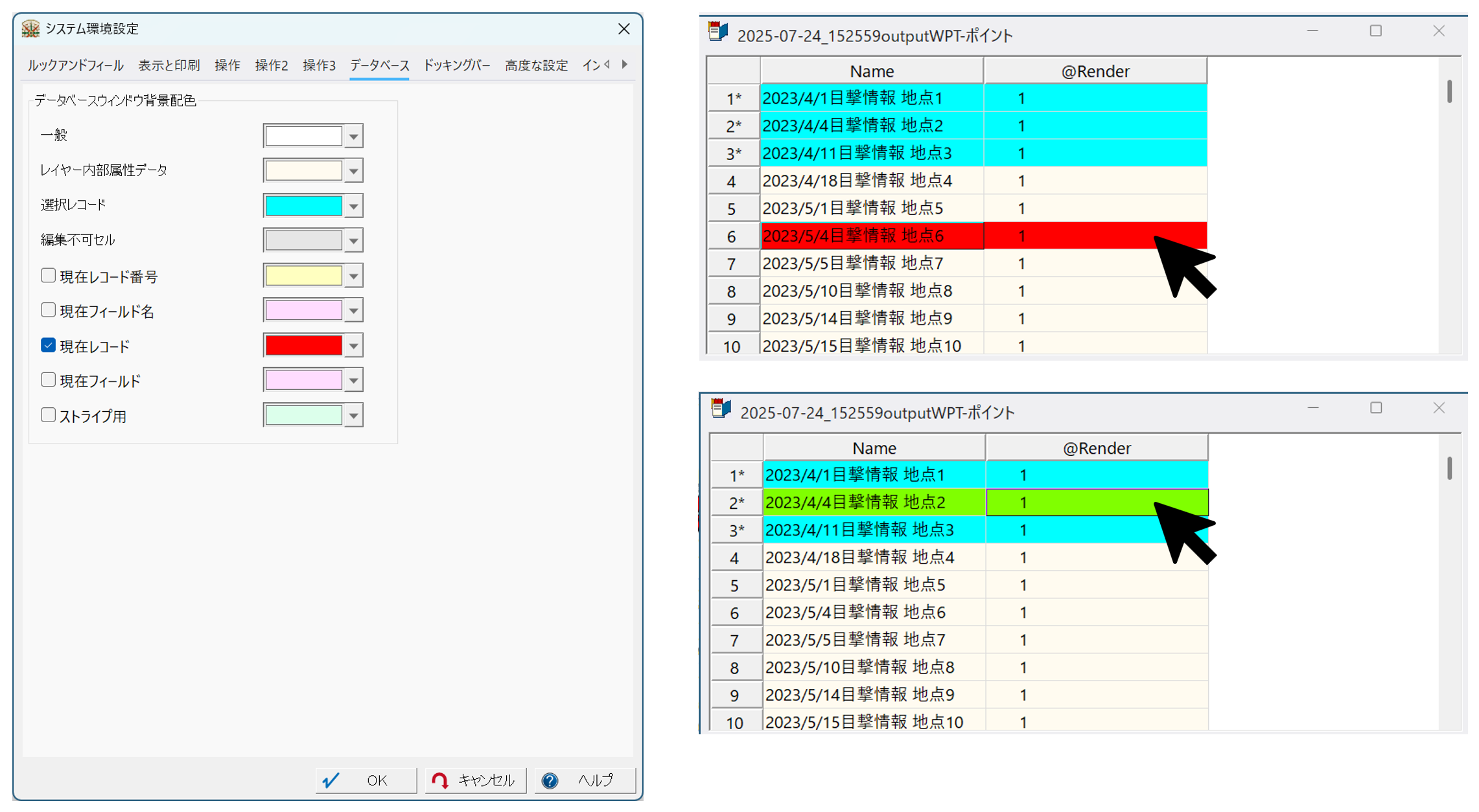 データベースウィンドウでの表示に関して、選択レコードのカレントレコードのそれぞれの指定色を、足して2で割ったような色になるようにしました。