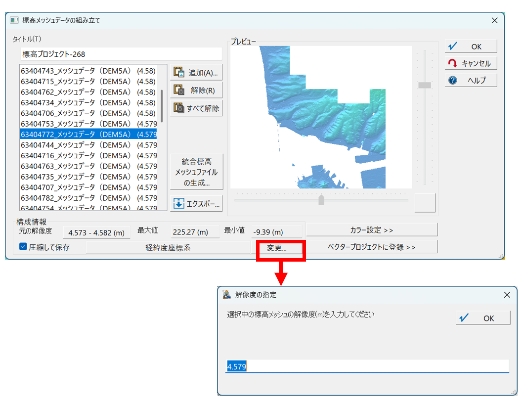 選択されている標高メッシュ分の解像度を明示的に変更できます。