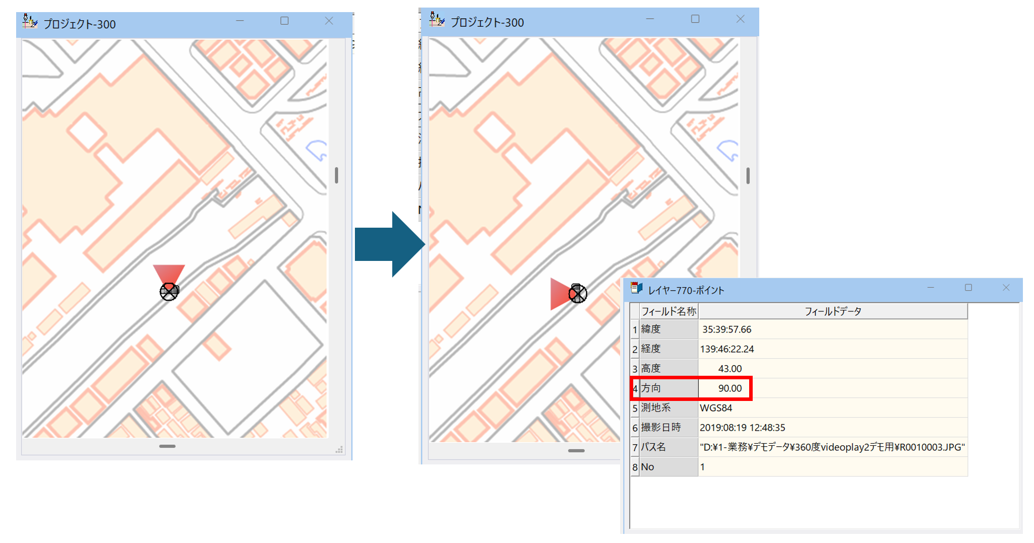 GPS情報付きEXIF-JPEGファイルの取り込みに関しまして、カメラの撮影方向情報のないデータに対して、点位置(進行)方向を基準にオフセットを指定して、カメラの向きを指定できるようにしました。