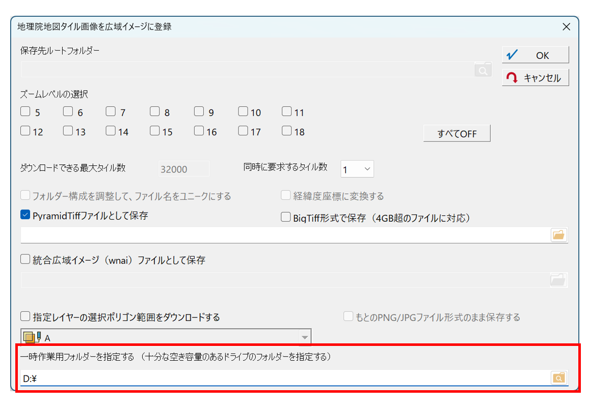 [地理院地図]-[応用的]-[地理院タイルを広域イメージに登録]で、「PyramidTiffファイルとして保存」もしくは「統合広域イメージ(wnai)ファイルとして保存」する場合、一時作業用フォルダーを指定できるようにしました。