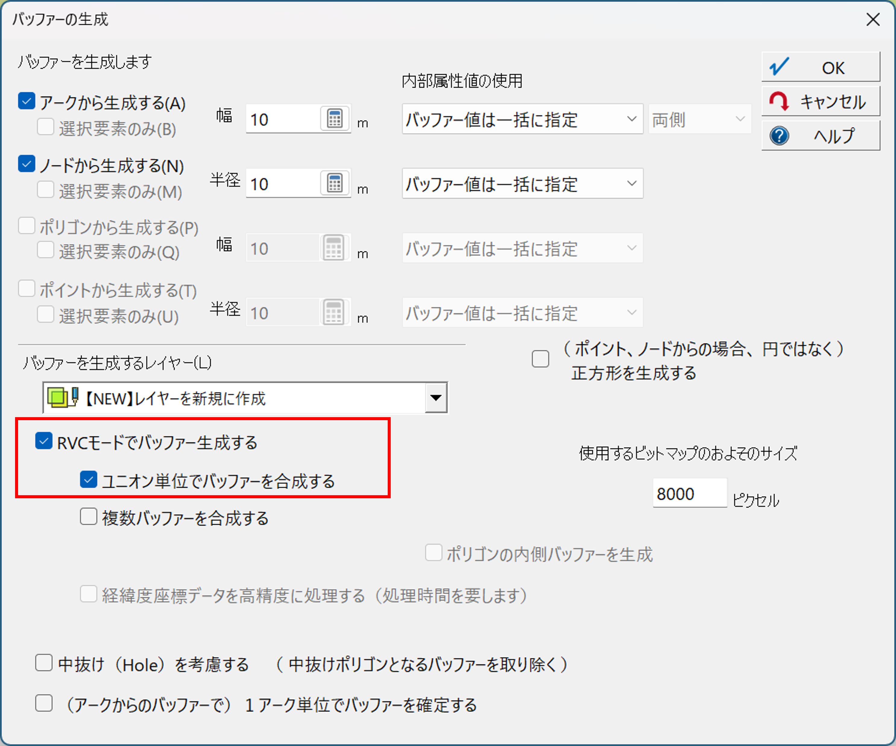 [ツール]-[領域検索]-[バッファー生成]-[バッファー生成]に関して、「ユニオン単位でバッファーを合成する 」を追加しました