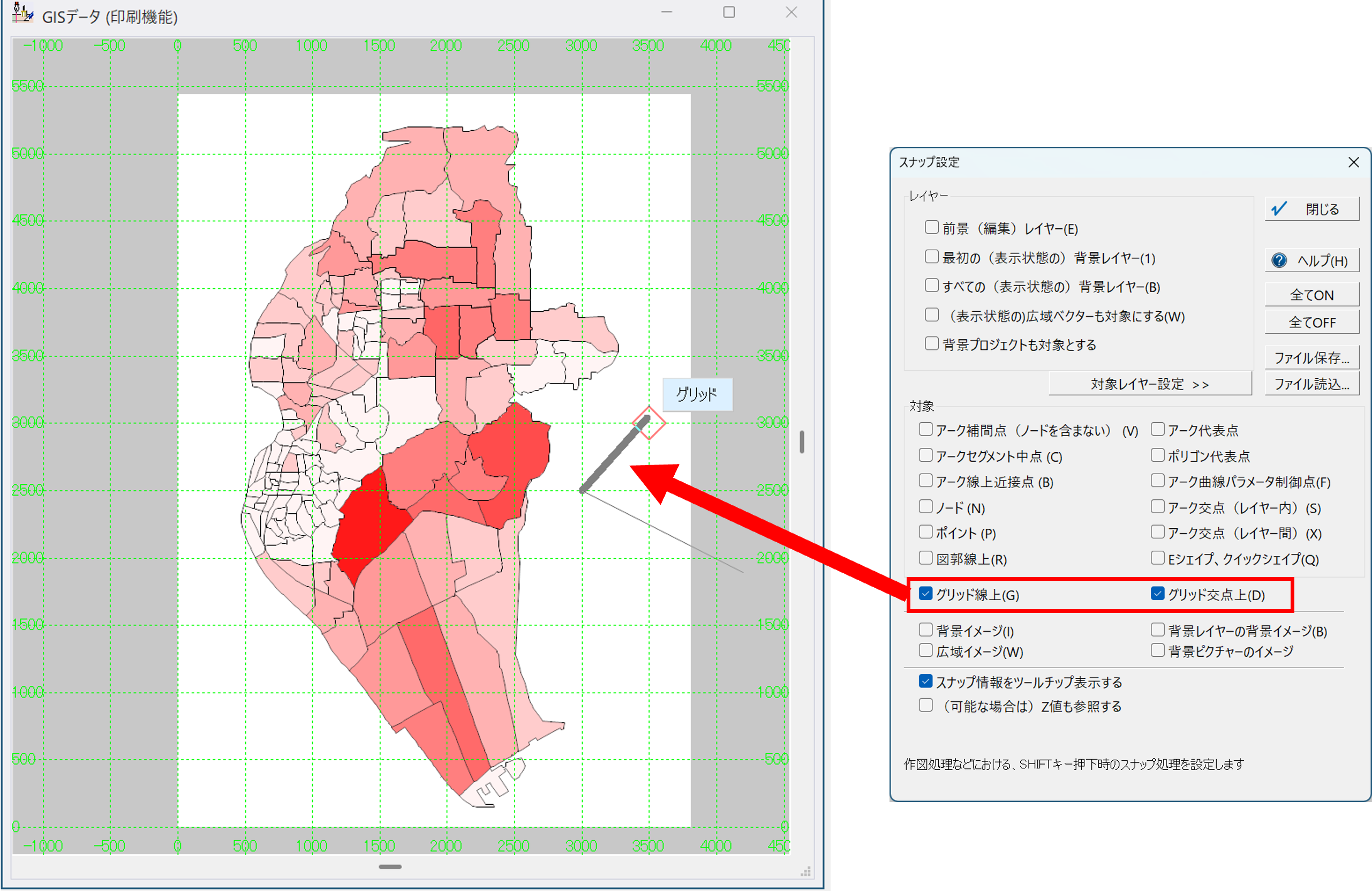 [(各種)印刷モード]グリッド線に対するスナップ設定